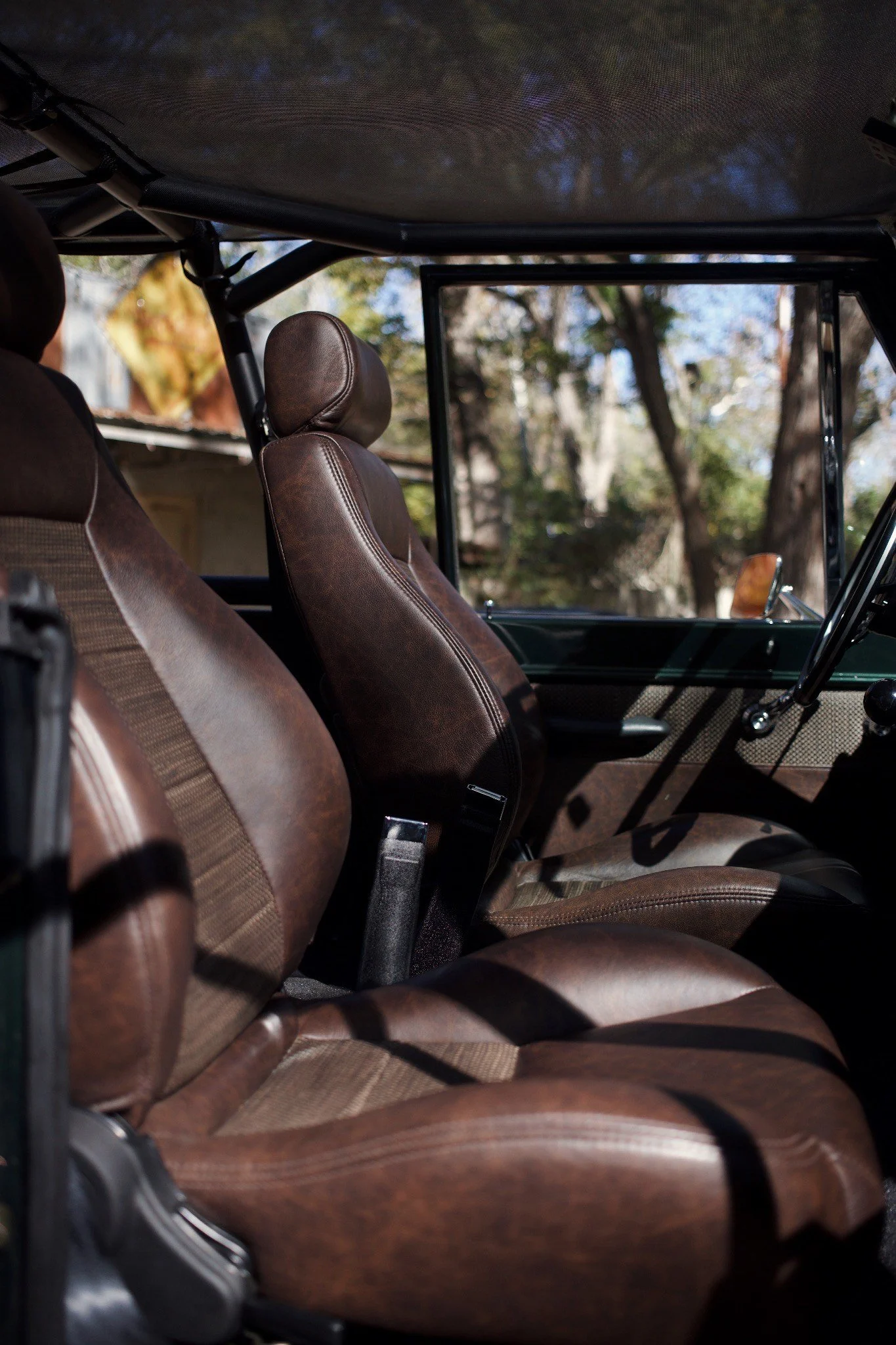 Nothing like getting into a dark green Bronco with that distressed leather! BUT not just any distressed leather or that diamond stitch we all see in these early Broncos. This interior brings a whole new level of “distressed leather” with added espresso colored weaving.